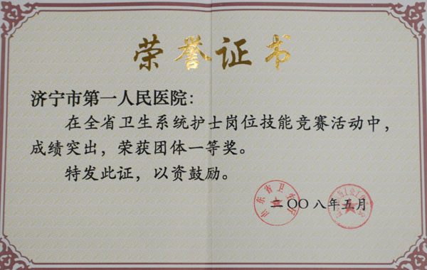 2008年 济宁市第一人民医院护理团队荣获山东省卫生系统护士岗位技能竞赛团队一等奖、个人特等奖