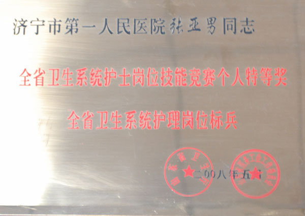 2008年 济宁市第一人民医院护理团队荣获山东省卫生系统护士岗位技能竞赛团队一等奖、个人特等奖