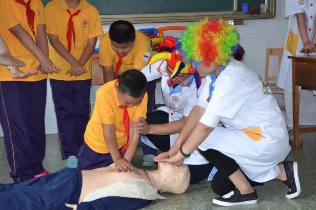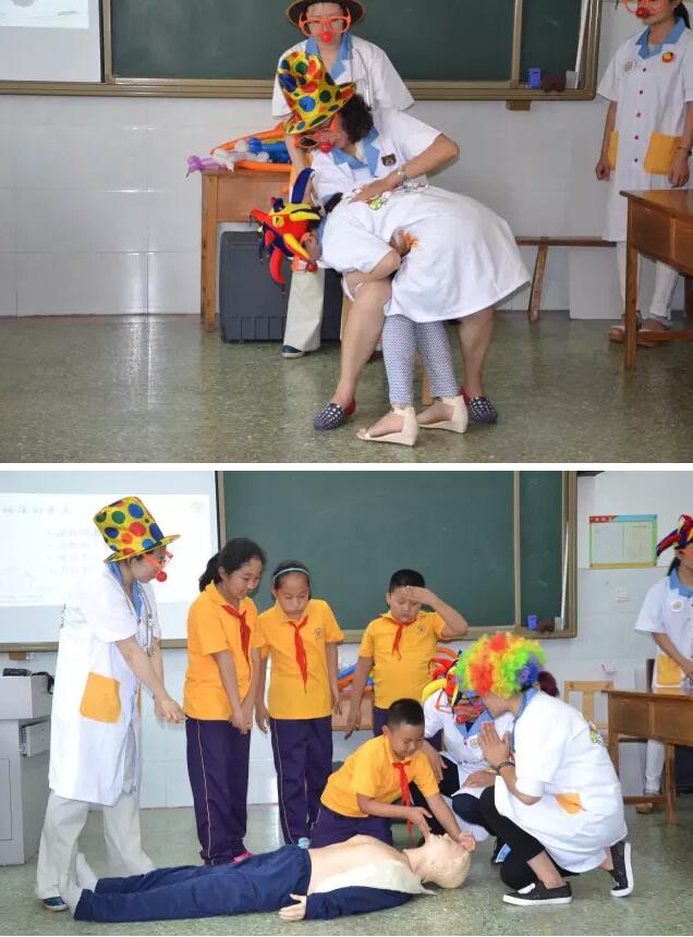 这个环节,我们小丑医生还交给小朋友心肺复苏的基本要领,带着大家互动式学习。