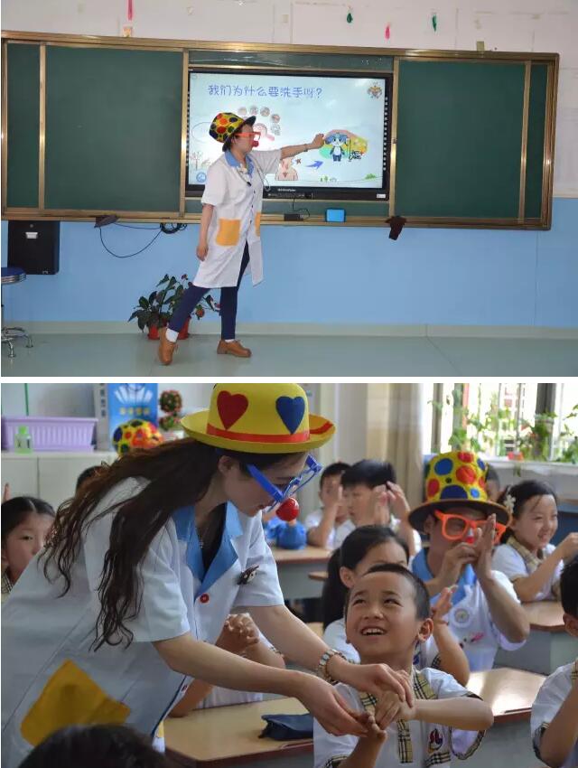 小丑医生通过PPT演讲教小朋友们如何科学洗手,并在孩子们身边耐心地指导大家科学洗手。