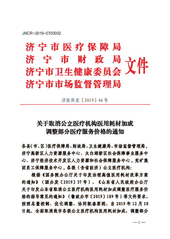 关于取消公立医疗机构医用耗材加成调整部分医疗服务价格的通知