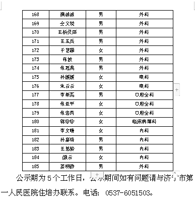 根据《山东省卫生健康委员会关于做好2020年度山东省住院医师规范化培训结业考核报名工作的通知》(鲁卫函[2020]213 号)文件要求,经住培医师报名、医院资格审核、住培医师本人确认,以下185人为拟报名人员,公示如下。