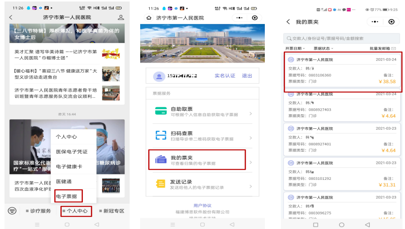 3.再次返回微信首界面,点击【个人中心】--进入【电子票据】--选择【我的票夹】,获取已经生成的电子票据。