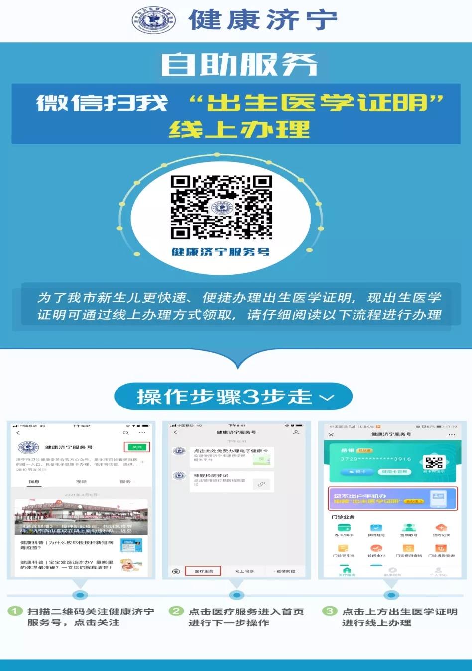 微信关注“健康济宁服务号”,即可享受线上办理出生医学证明并邮寄到家的便民利民服务。