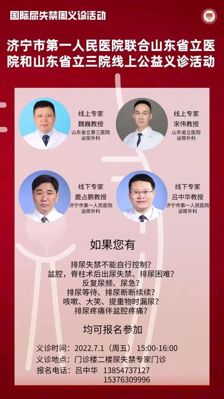 在“国际尿失禁周”来临之际,济宁市第一人民医院泌尿外科开展线上线下多地专家联合义诊公益活动,届时将邀请省内知名专家——山东省立第三医院泌尿外科魏巍主任和山东省立医院泌尿外科宋伟主任,联合我院泌尿外科鹿占鹏主任和吕中华教授,共同为广大市民朋友答疑解惑。愿您和家人朋友能不受尿失禁困扰,静享美好生活~