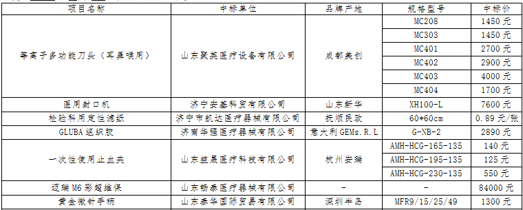 济宁市第一人民医院6月12日医疗器械、耗材中标公示