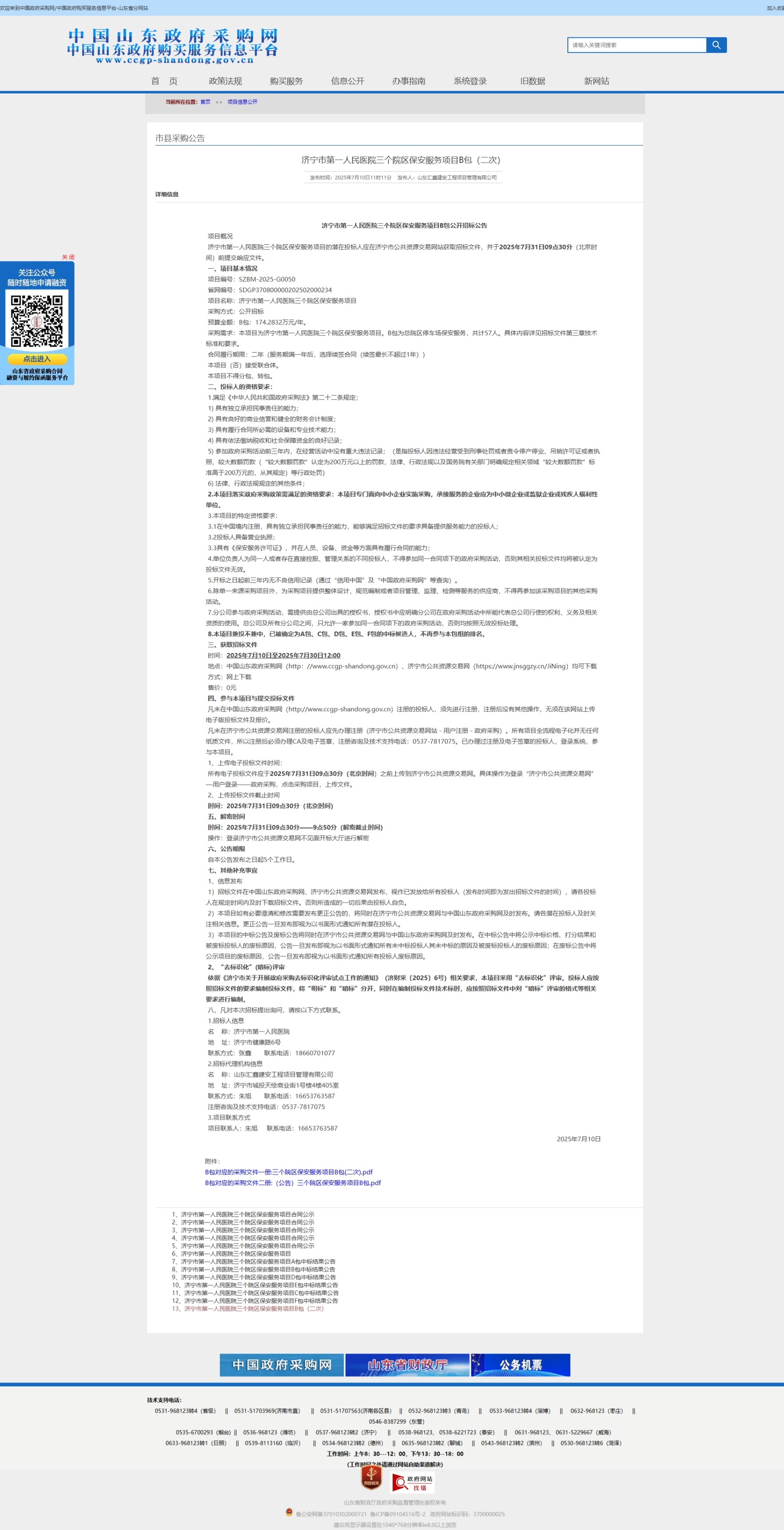 济宁市第一人民医院三个院区保安服务项目B包(二次)公开招标公告