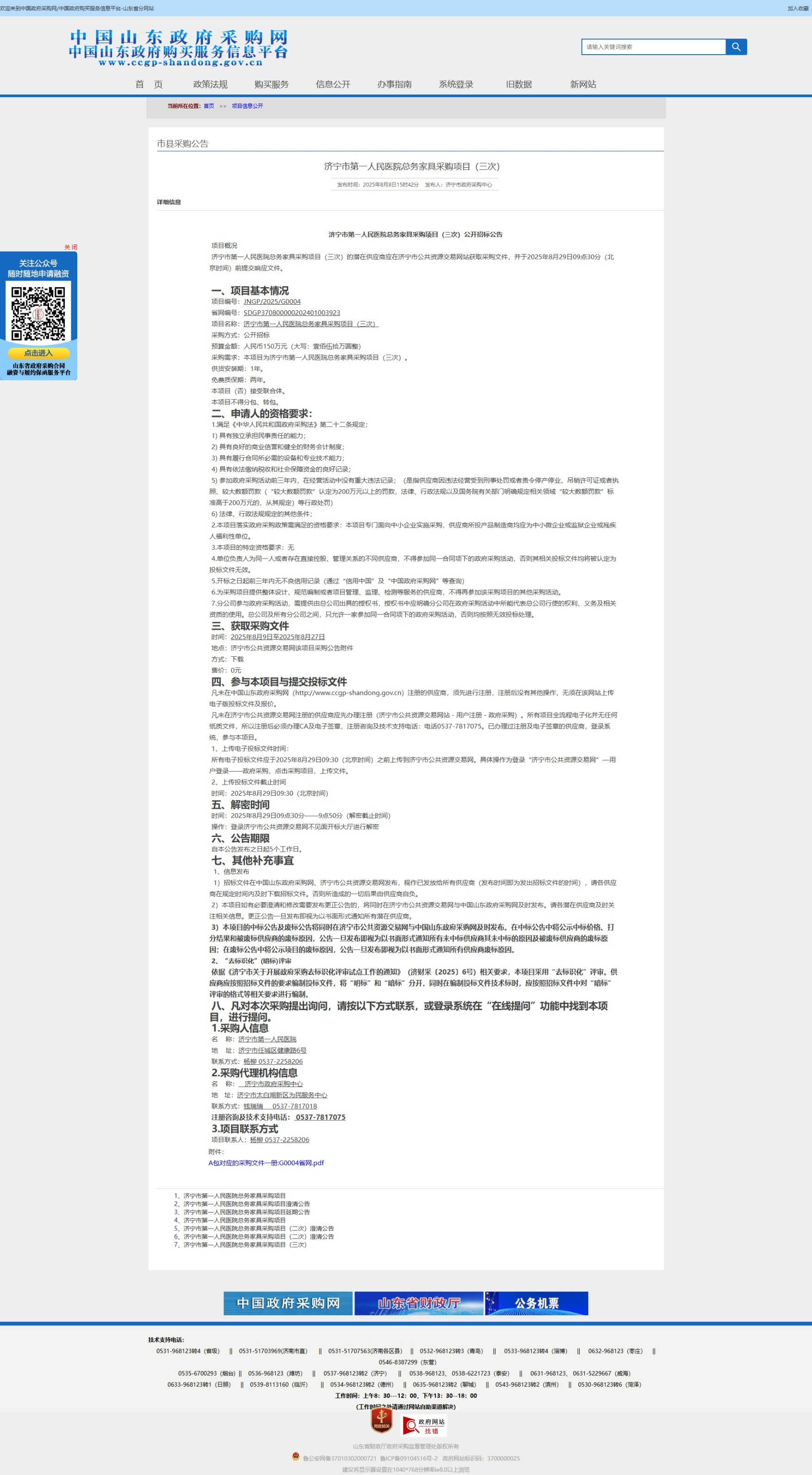 济宁市第一人民医院总务家具采购项目(三次)公开招标公告