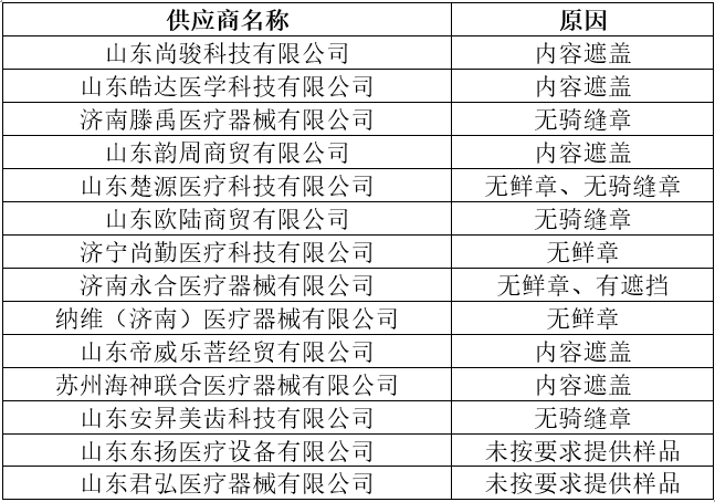 根据《济宁市第一人民医院供应商备案管理办法(试行)》规定,现将“未按招标文件要求制作标书”(包括投标文件内容遮挡、无鲜章、无骑缝章、未按要求提供样品等)的供应商进行警告,公示如下: