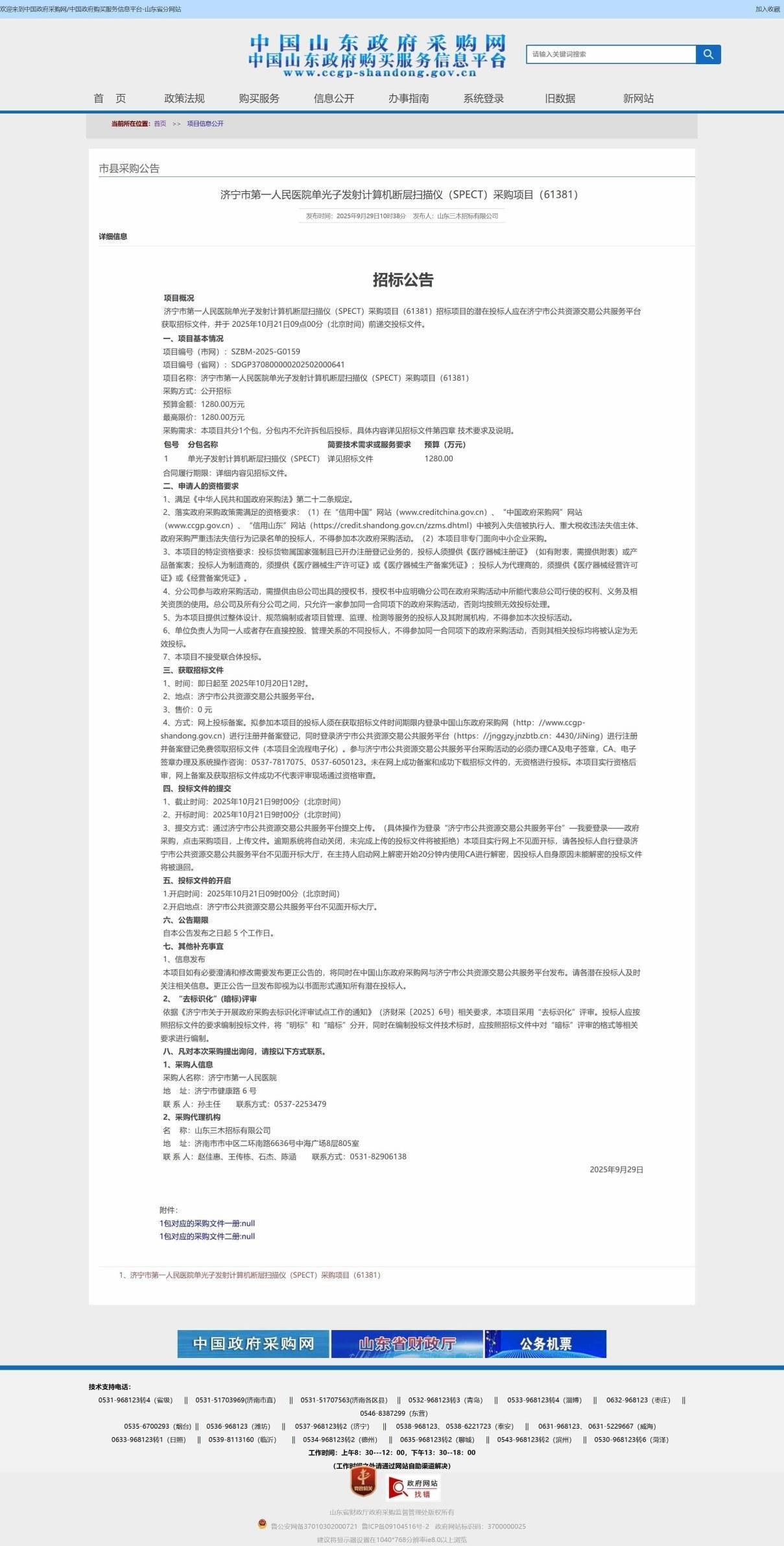 济宁市第一人民医院单光子发射计算机断层扫描仪(SPECT)采购项目(61381)招标公告