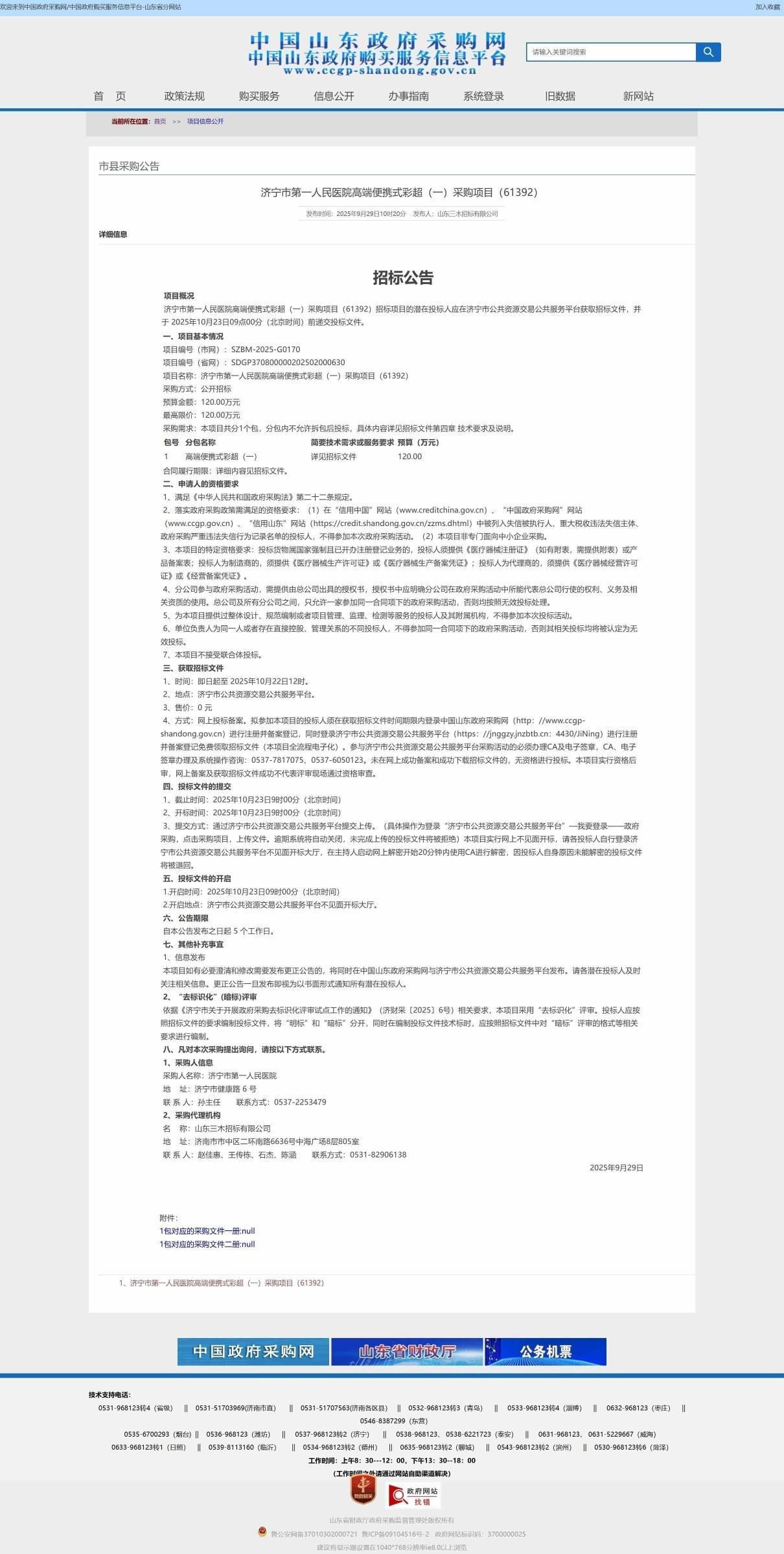济宁市第一人民医院高端便携式彩超(一)采购项目(61392)招标公告