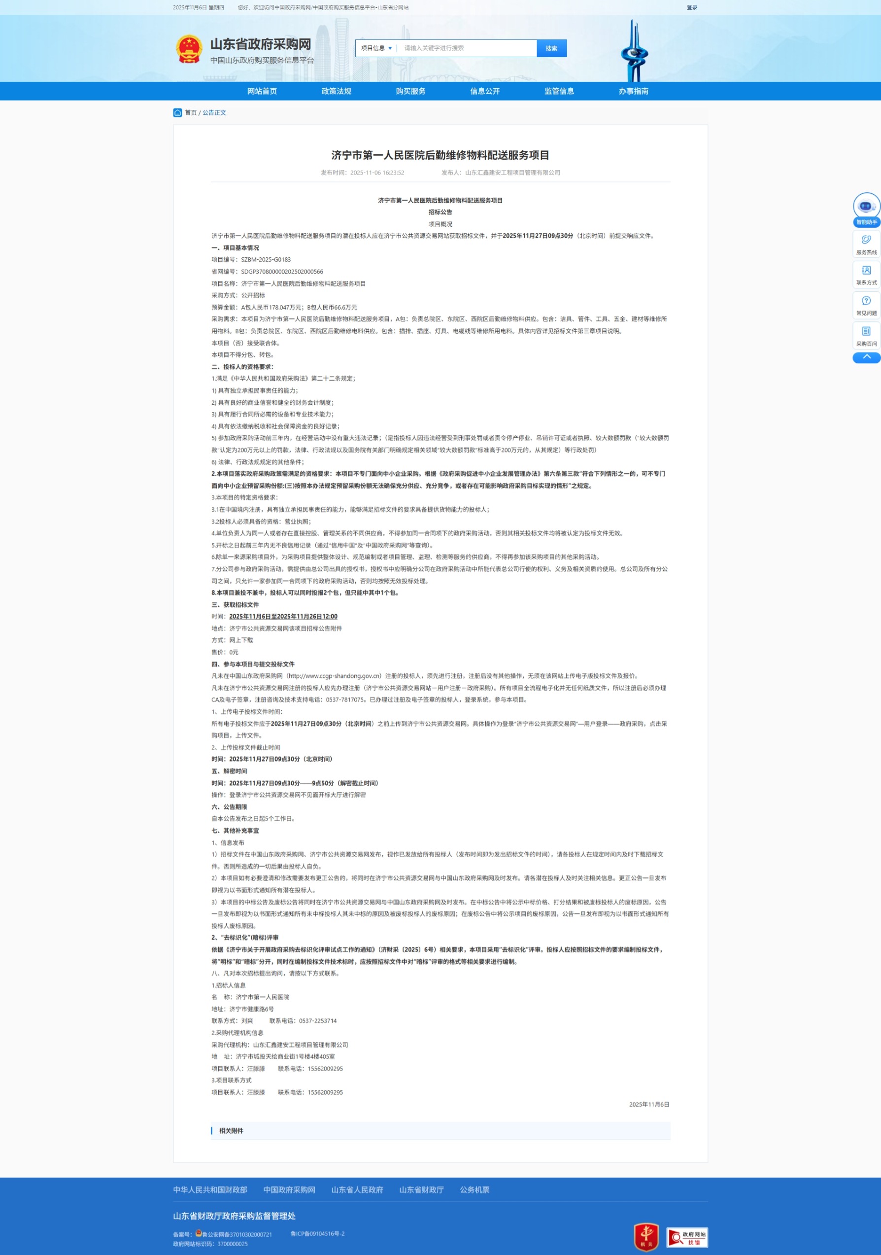 济宁市第一人民医院后勤维修物料配送服务项目招标公告