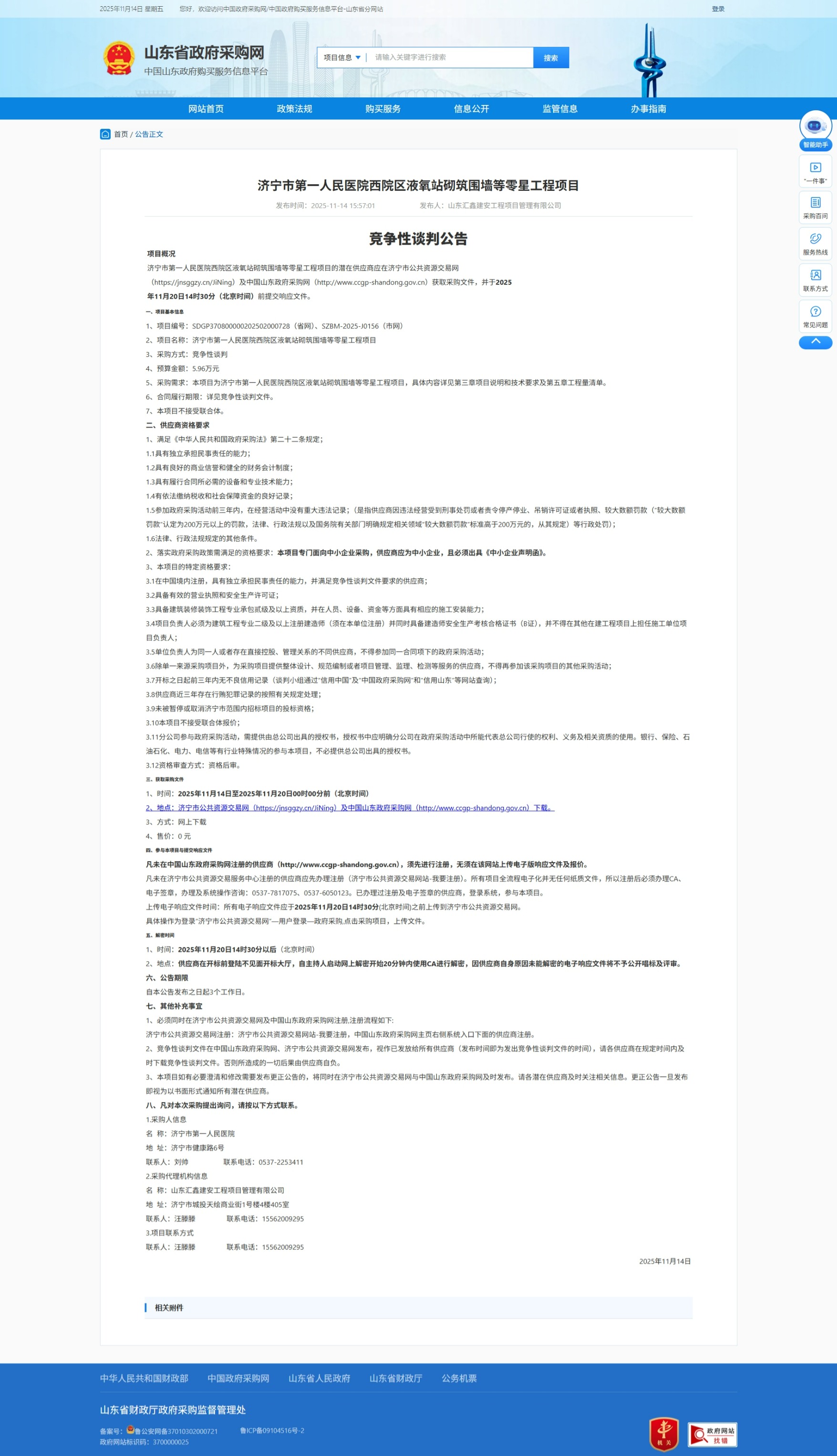 济宁市第一人民医院西院区液氧站砌筑围墙等零星工程项目竞争性谈判公告