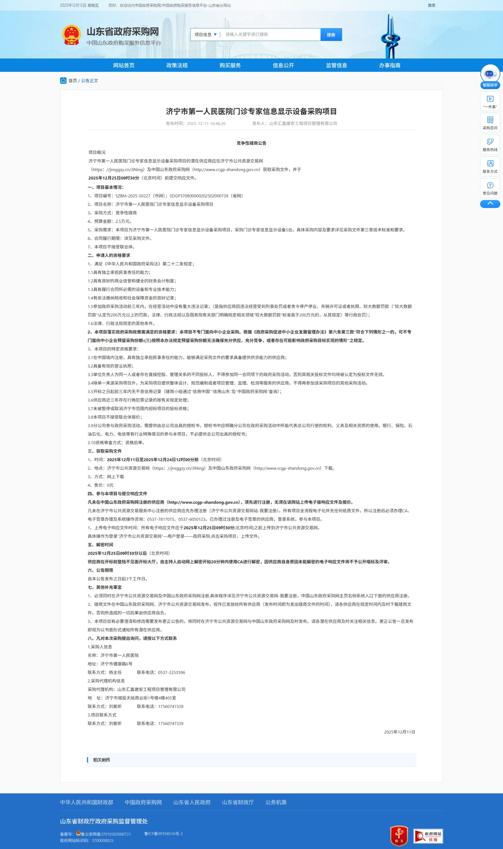 济宁市第一人民医院门诊专家信息显示设备采购项目竞争性磋商公告