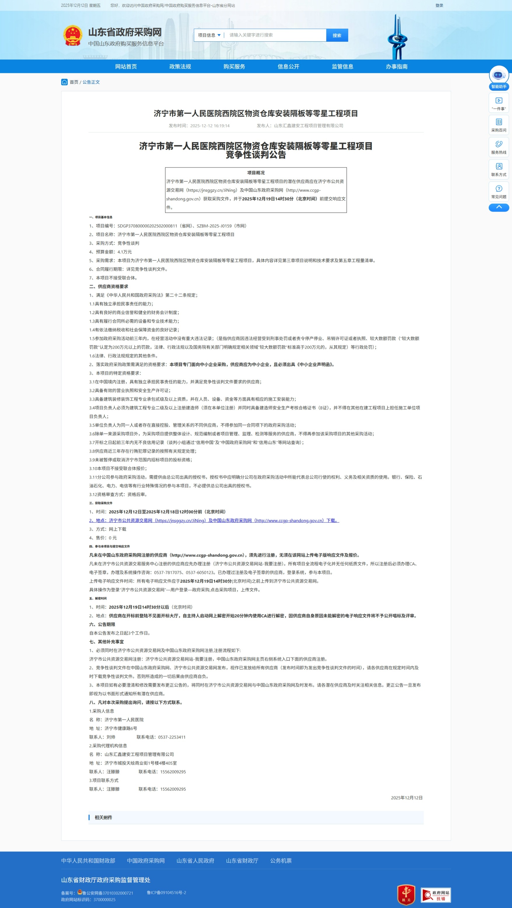 济宁市第一人民医院西院区物资仓库安装隔板等零星工程项目竞争性谈判公告
