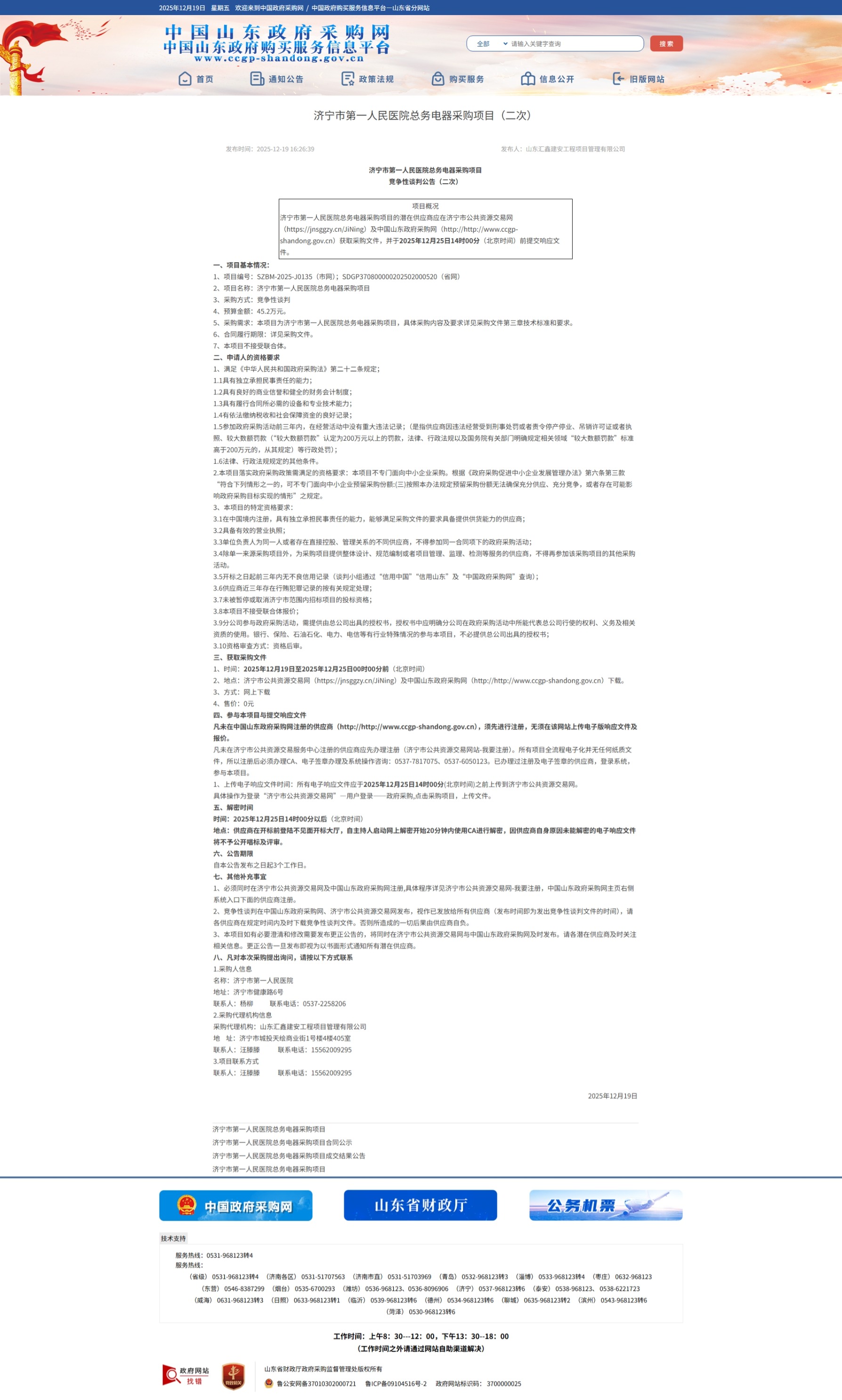 济宁市第一人民医院总务电器采购项目竞争性谈判公告(二次)