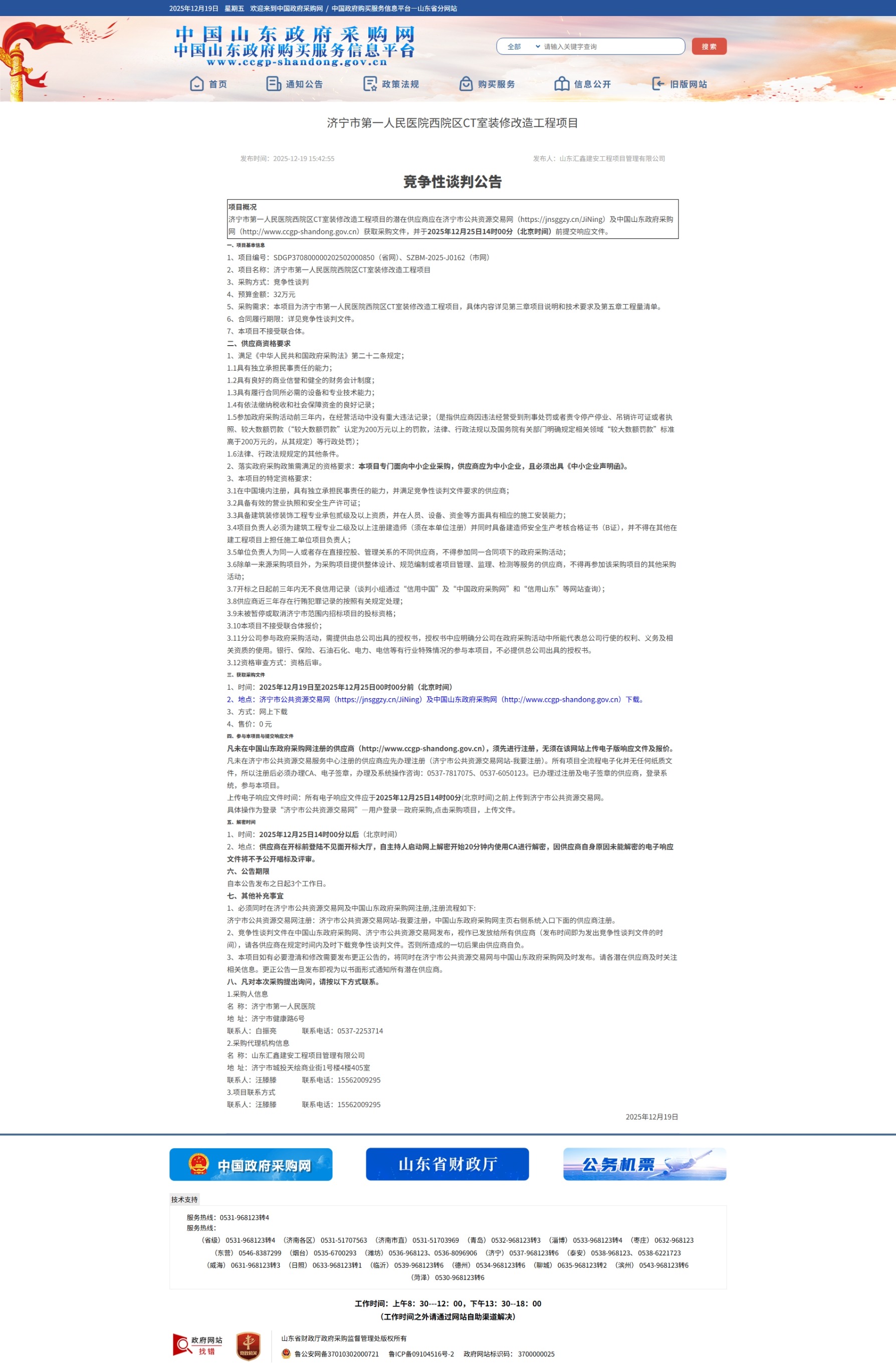 济宁市第一人民医院西院区CT室装修改造工程项目竞争性谈判公告