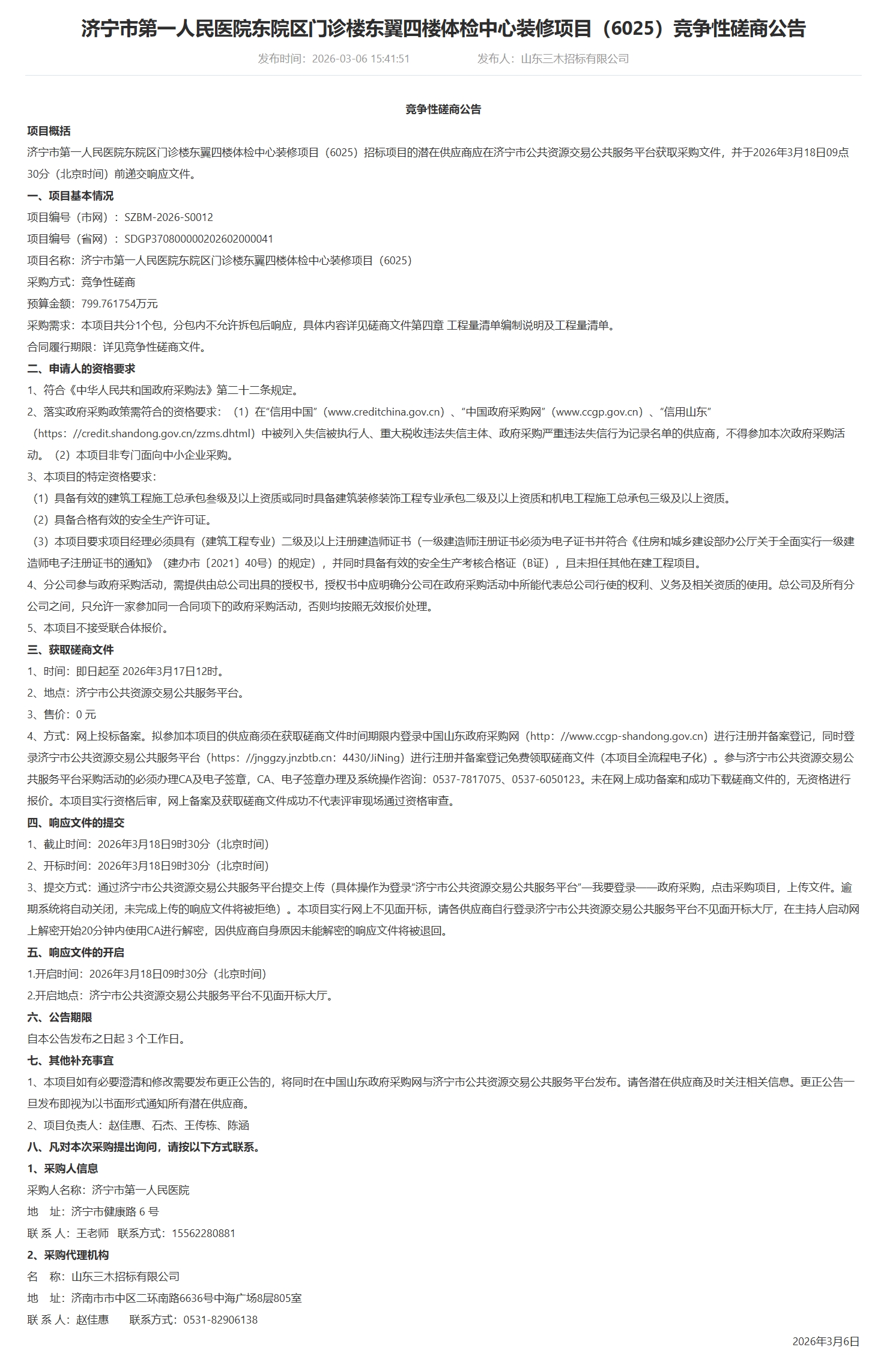 济宁市第一人民医院东院区门诊楼东翼四楼体检中心装修项目(6025)竞争性磋商公告