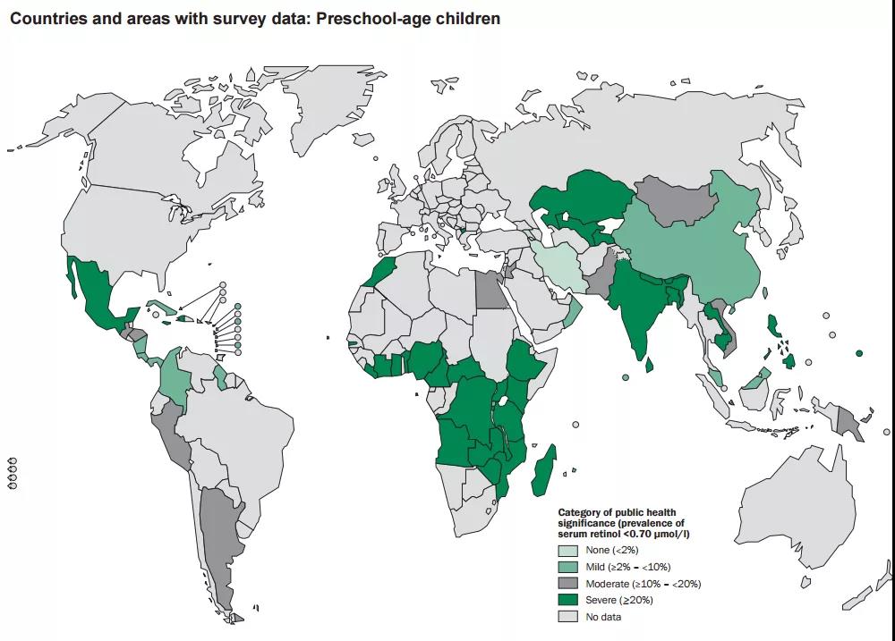 2009年世界卫生组织WHO报道了全球范围内1995年-2005年十年间学龄前儿童的流行病学数据(见下图,地图数据来源于调查数据和基于回归估计的国家和地区),证实维生素A缺乏症依然是影响全球儿童的公共卫生问题,维生素A缺乏形势严峻,我国亦不例外。