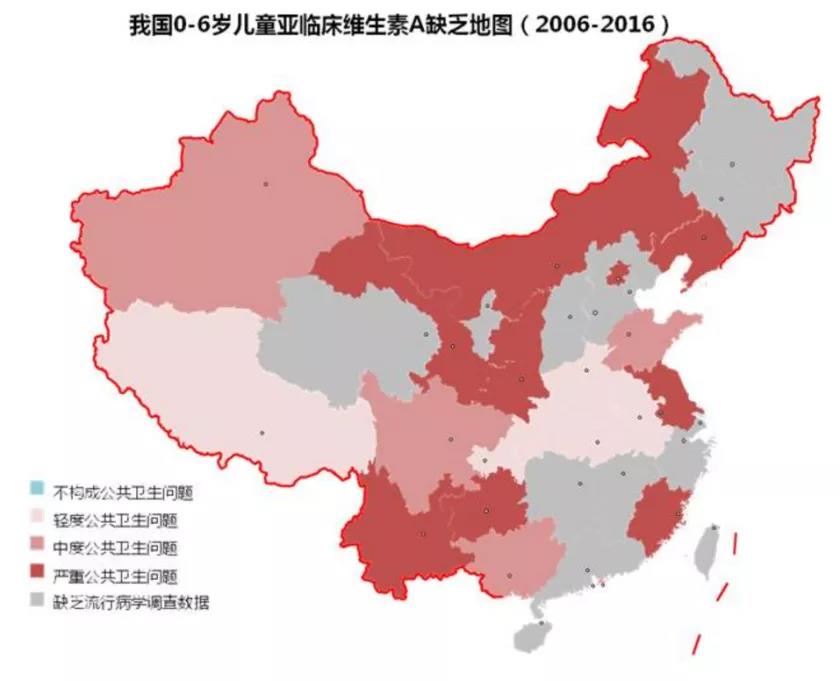 可能您会提出疑问,这都是十多年前的数据了,没有参考价值。那接下来就看一下我国各地2006-2016年0-6岁儿童的维生素A流行病学调查数据(见下图,地图引用自医学界儿科频道,基于多地流行病学调查数据进行检索和整理)。