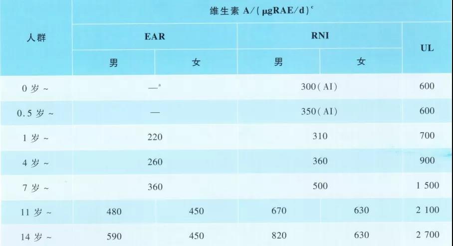 下表是2013年及2016年中国居民膳食指南中关于儿童维生素A的参考摄入量,其中6月龄以下婴儿的推荐摄入量最低,为300 ug/d,即1000IU/天;可耐受最高摄入量为600ug/d,即2000IU/天,所以每天一粒维生素AD滴剂是属于安全范围的(目前济宁市售制剂中,每粒含维生素A 1500-2000IU、维生素D 500-700IU,在给孩子喂服时,胶囊上肯定有残留,所以每粒胶囊中的药物不会完全进肚)。