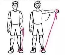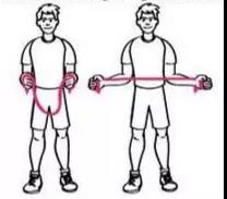 第一个动作:手持弹力带,上臂加紧躯干,前臂向内或向外做旋转,做5-8个。