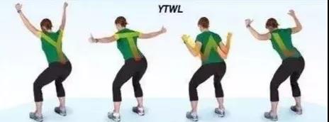 膝关节微曲,腰背挺直,上臂分别作出“Y、T、W、L”字母形状,并向背部夹紧,每个字母做5-8个即可。