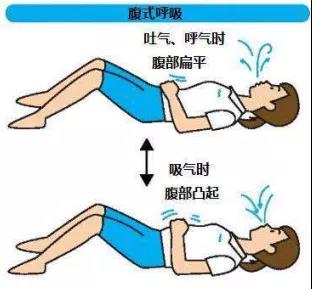 平躺,手放在肚脐上,吸气时腹部凸起,呼气时腹部扁平,每次8-10个。