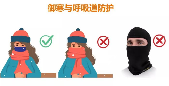 天气寒冷,很多人会佩戴围巾,但围巾阻挡不了新冠病毒,必须戴好口罩后再佩戴围巾。同时头套也不能作为防护装备。