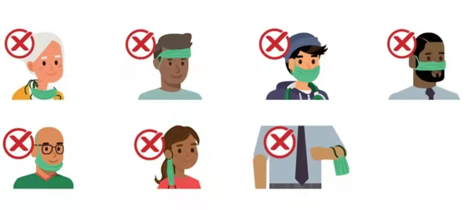 以上几种佩戴口罩的方式都是不可取的,且十分危险,佩戴口罩,保障效果最重要,且避免口罩带来的污染非常关键!