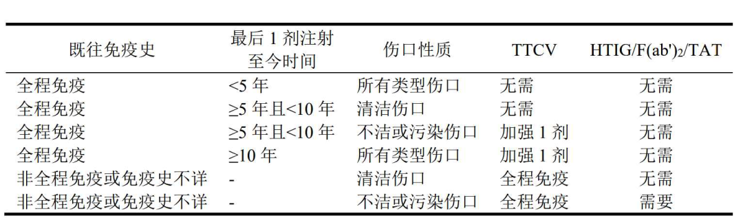 (2)全程免疫最后一次注射后≥5年但不足10年。清洁伤口不推荐使用TTCV、HTIG、F(ab')2或TAT。不洁伤口和污染伤口应加强接种1剂TTCV,不推荐使用HTIG、F(ab')2或TAT。