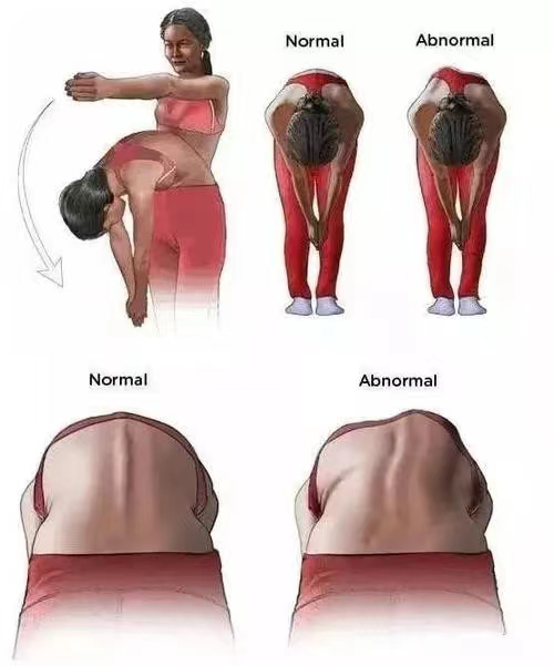 受检者直膝合足、自然站立,双臂伸直合掌、缓慢向前弯腰至90°,检查者从后方及侧方观察,如背部出现不平或隆起,则提示脊柱侧弯或后凸。