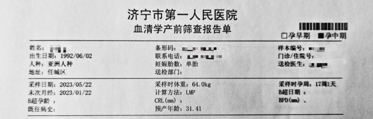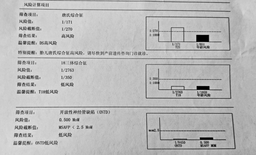 结果说明:低风险只表明胎儿发生该种先天异常的可能性较低,并不能完全排除这种异常或其他异常的可能性。高风险、临界风险只表明胎儿发生该种先天异常的可能性较高或稍高,并不是确诊,建议尽快到医院产前遗传咨询门诊就诊,做介入性产前诊断或孕妇外周血胎儿游离DNA产前检测(即无创DNA产前检测),综合每一项风险值,给予次产前筛查最终的风险分析及建议。