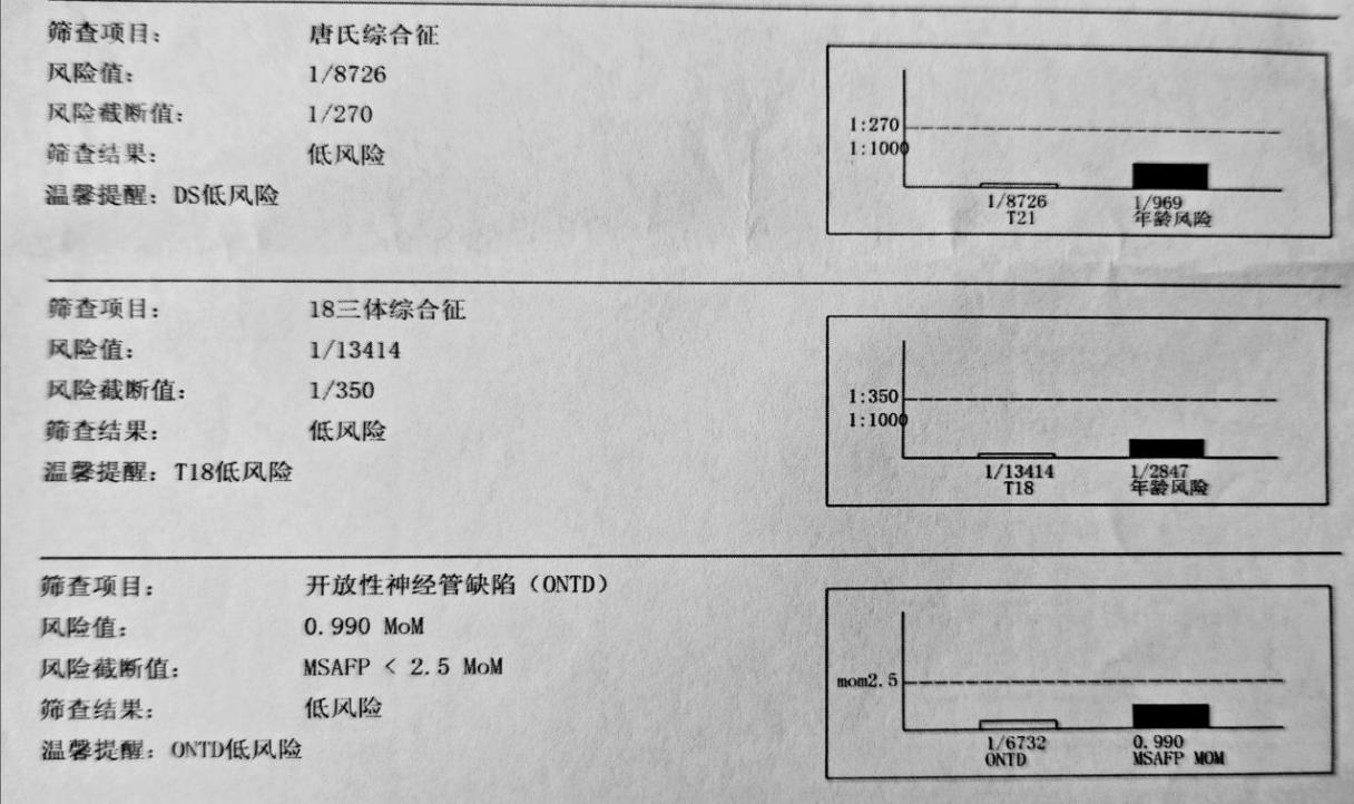①低风险:(21三体风险值<1/270 ,18三体风险值<1/350),只表明您的胎儿发生该种先天异常的机会较低,并不能完全排除这种异常或其他异常的可能性。
