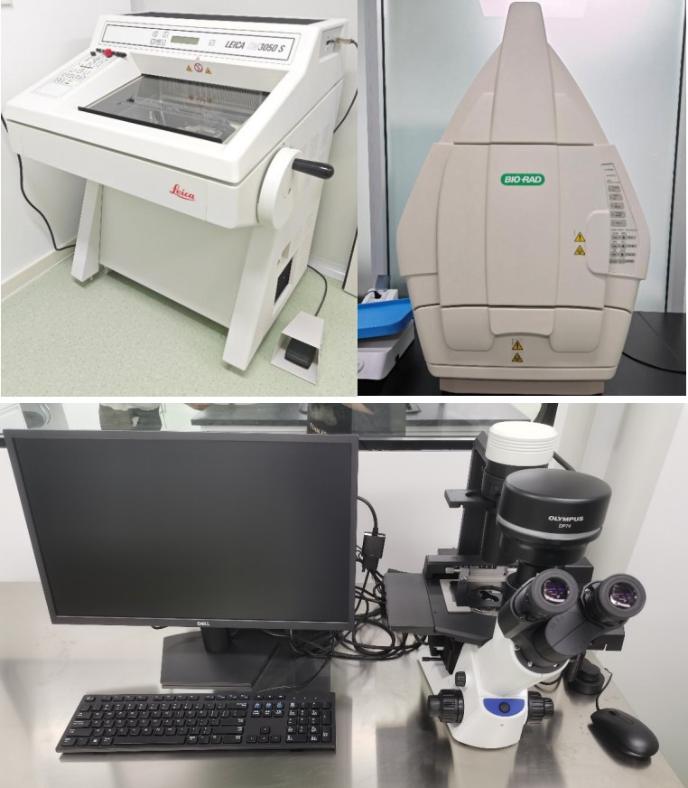 冰冻切片机CM3050S、荧光显微镜CKX53、Bio-rad电泳成像系统ChemiDoc XRS+、SCILOGEX高速微量冷冻离心机和生物显微镜CX33等。
