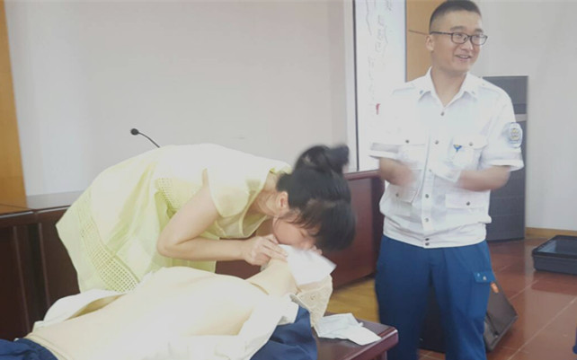 活动中,志愿者们针对企业生产中的突发外伤、电击伤、烧烫伤、毒气泄漏、中暑等常见疾病和公共卫生事件进行了现场急救和处理的理论宣教;同时对如何拨打120,打120急救电话的注意事项进行了普及;最后进行了心肺复苏、外伤止血包扎、骨折的固定和搬运的现场操作演示。在场人员积极参与互动,纷纷上台亲自操作胸外心脏按压和人工呼吸。大家纷纷表示,今天的培训十分有意义,也很实用,通过图文并茂的讲授,加上现场体验实际操作,从中受益匪浅,今后可以将学到的急救知识和理念传递给家人和朋友,同时去帮助那些在危急时刻需要帮助的人们,为他们的生命安全争取宝贵的时间。