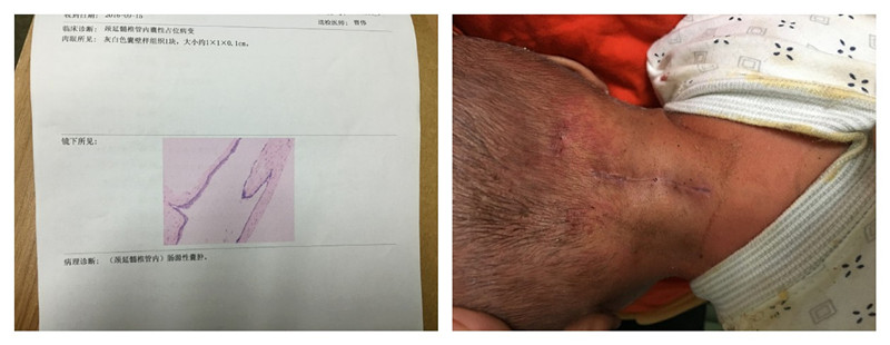 患儿被收住院以后,程启龙主任手术团队积极完善术前检查,考虑患儿年龄小、营养差、病变部位手术风险极高、难度大。全科进行了病例讨论,反复推敲、预演手术步骤,并多次与麻醉科、重症医学科进行沟通协作,制定了缜密的诊疗计划和手术方案,确保了围手术期、手术的安全顺利。手术后,患者又经过了耐心细致的治疗,目前,小患者已经康复出院,术后病理诊断为肠源性囊肿。该例患儿的成功手术以及术后治疗,为我科以后常规开展小儿高颈段病变积累了经验。