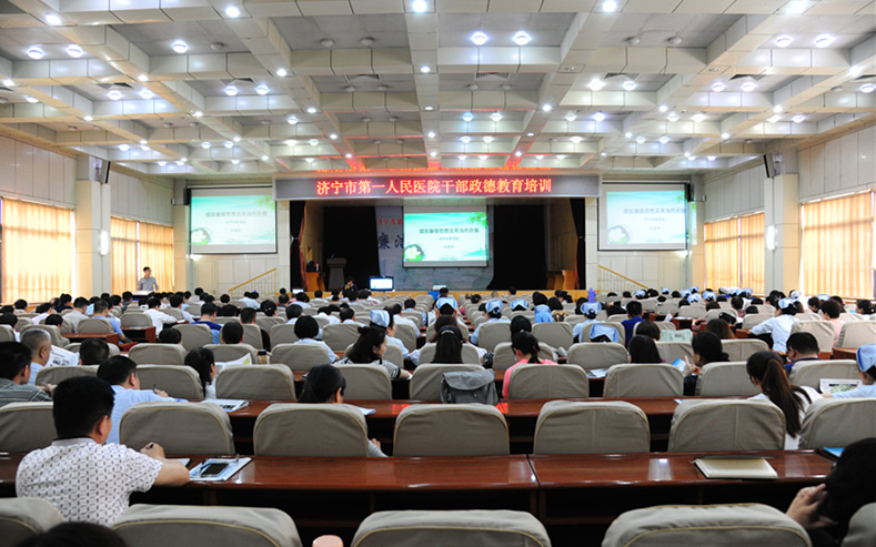 为进一步深入开展“解放思想大讨论”、“遵规守纪大教育”、“干部作风大转变”等活动,深入学习习近平总书记关于传承和弘扬中华优秀传统文化重要讲话精神,2017年5月11日下午,我院举办干部政德教育培训,邀请济宁市委党校基础教研部主任杜爱华教授作了题为《儒家廉德思想及其当代价值》的专题报告。医院党委委员、纪委书记郭金菊同志主持会议,医院领导班子成员、职能科室正副主任、临床医技科室正副主任、正副护士长等中层领导干部300余人到场聆听讲座。