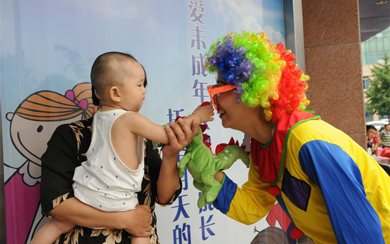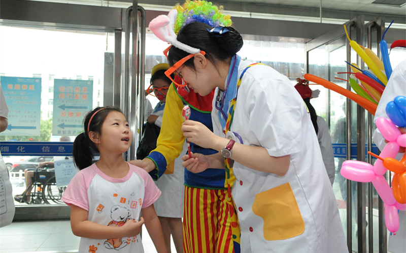 活动现场,“小丑医生”们分头行动,不断从袋子里变出各种气球做成的小动物,送给小患者们。这些逗孩子们开心的“小丑医生”志愿者,其实都是医院的医务人员。他们利用业余时间,让孩子们在开怀大笑中忘记病痛。
