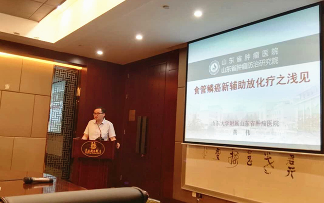 山东省肿瘤医院李宝生副院长到会并致辞。山东省肿瘤医院黄伟教授就食管癌新辅助放化疗做了精彩的报告。参会专家同时就多例局部晚期食管癌患者展开了讨论,各专业的参会专家均踊跃发言。