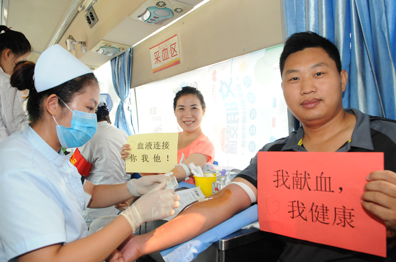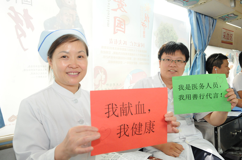 采血车内,心内科的孔德玉医生脖子上挂着听诊器在工作间隙来奉献爱心,献血后又匆忙回到工作岗位上;胃肠外科的副主任医师朱镇下夜班来献血,已经是多次献血者的他神情自若,为第一次来献血的人做出了榜样,缓解了他们紧张的情绪;临床服务部的护师巩芬说:“为了成功献血,我已提前多天锻炼身体。”在献血车上她把献血量由200改为400毫升;体重才50公斤乳甲外科的护士王丽说:“我工作30多年了,经常看到那些需要量输血的病人,为了他们我要献爱心”。