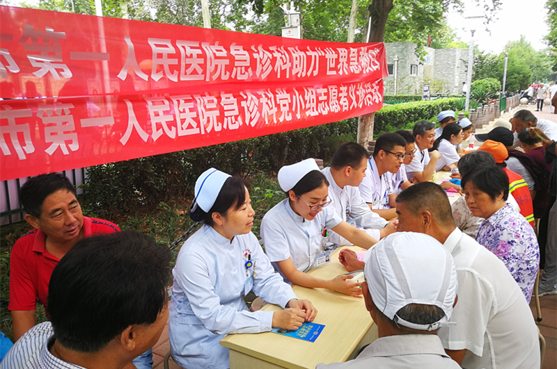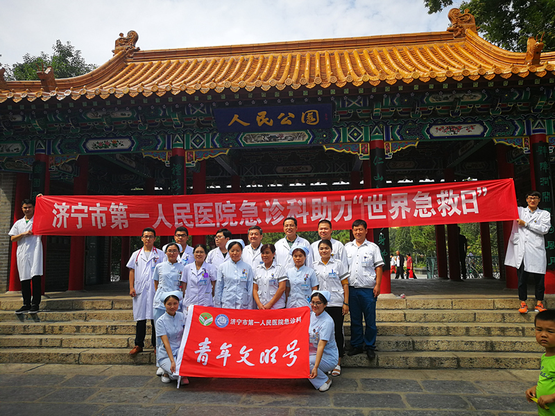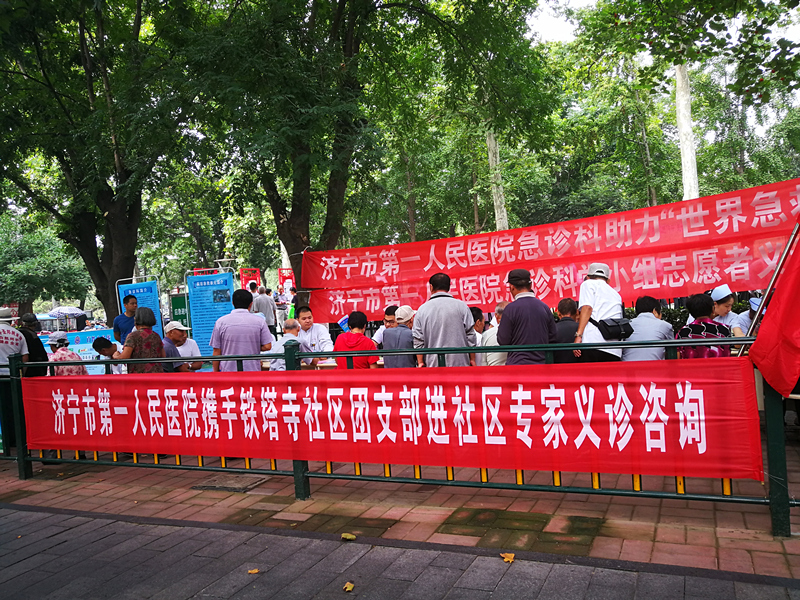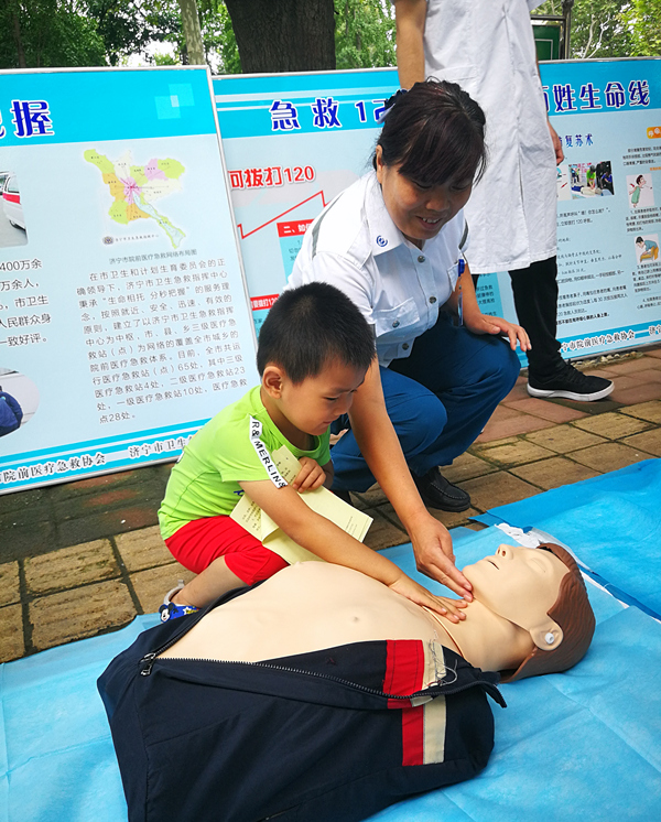 为助力第18个“世界急救日”,更好的普及急救知识,提高群众自救互救能力,9月9日上午,在市卫生急救指挥中心和古槐街道办事处铁塔寺社区的大力支持下,我院急诊科组织广大党员、团员、青年志愿者走进济宁人民公园,开展急救知识宣传活动。