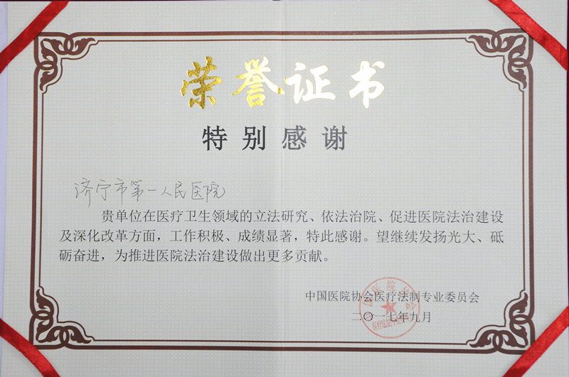 2000年医院执行了法律顾问制度。2003年成立了医疗安全部,使医疗纠纷处理专业化。2007年济宁市建立了第三方医患纠纷调处机制,从此我院不私自协商处理医疗纠纷,使医疗纠纷处理规范化。多年来,在医院保卫部及公安机关大力支持下,严格按照医疗纠纷处理的相关法律法规处理纠纷,赔付数额合理,有效遏制群体性医疗纠纷发生,无医务人员受伤及公私财物损毁情况发生,无任何处罚记录及重大不良影响事件发生,医疗纠纷处理形成了济宁模式。我院每年两次聘请全国知名卫生法学专家来我院授课,积极参加中国医院协会法制专业委员会的课题研究工作,在提升医疗法制建设水平、维护医患合法权益、保障良好医疗秩序发挥了重要作用。引领了我市医疗机构医疗法制建设正常化及医疗纠纷防范与处理专业化、规范化。