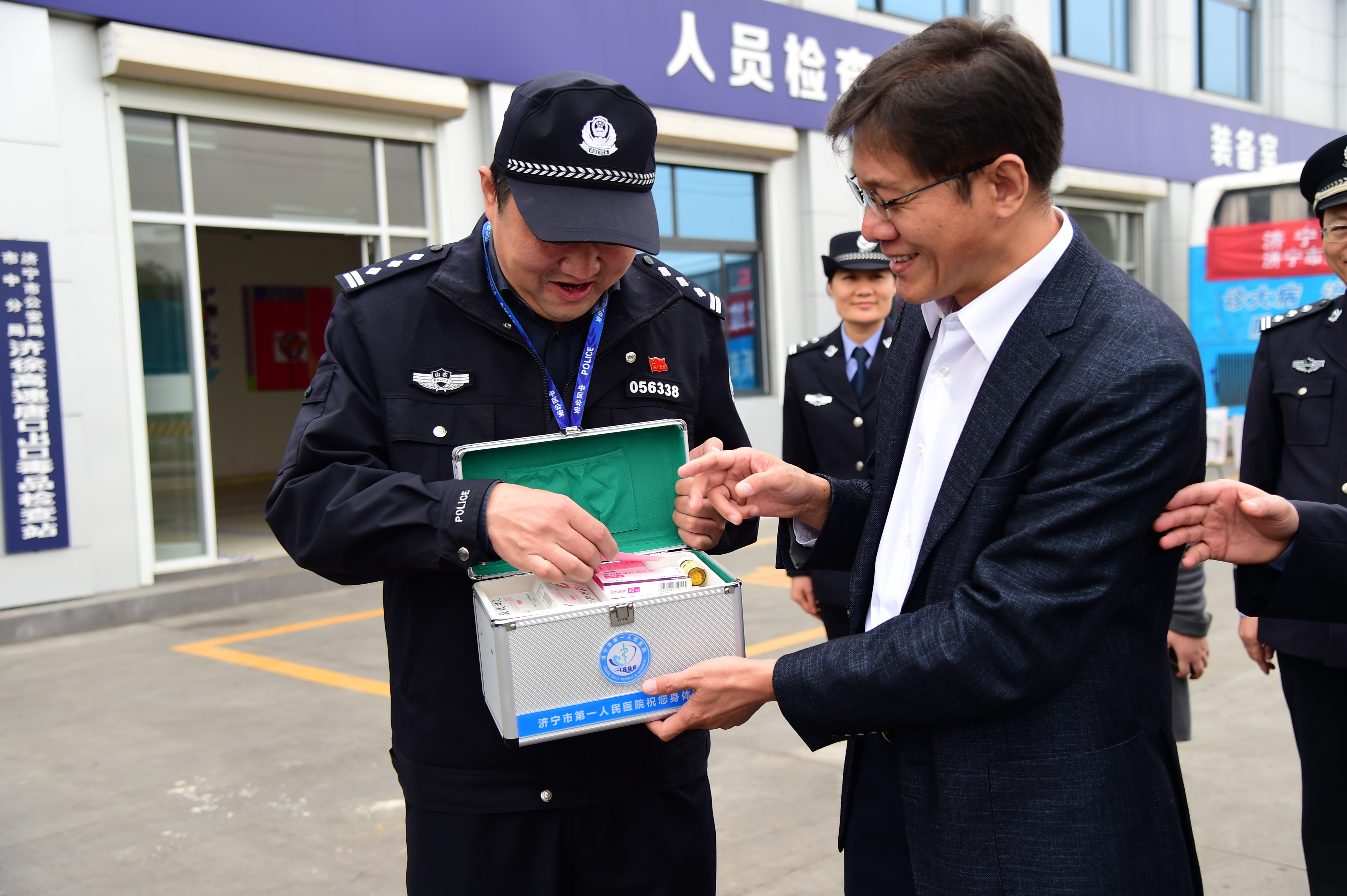 10月18日,济宁市公安局联合济宁市第一人民医院在济徐高速唐口检查站开展“十九大安保维稳送医上岗”活动,为一线坚守岗位的公安干警们送去健康,并向检查站赠送保健箱及常用药品。