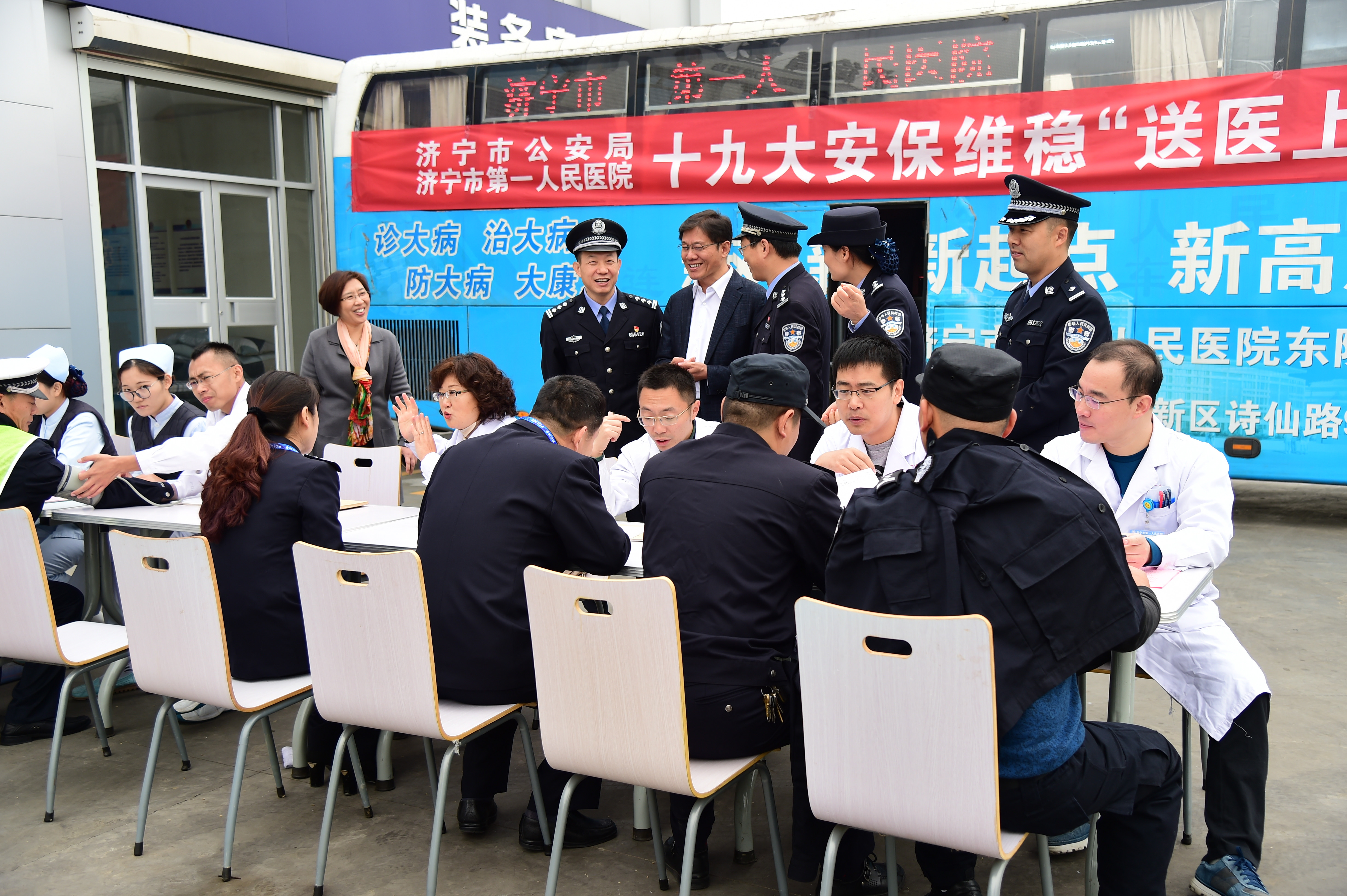 17日,济宁市第一人民医院联合济宁市公安局共同开展“十九大安保维稳送医上岗”活动,济宁市第一人民医院健康直送车首站开进微山,为保一方平安的公安干警送健康。