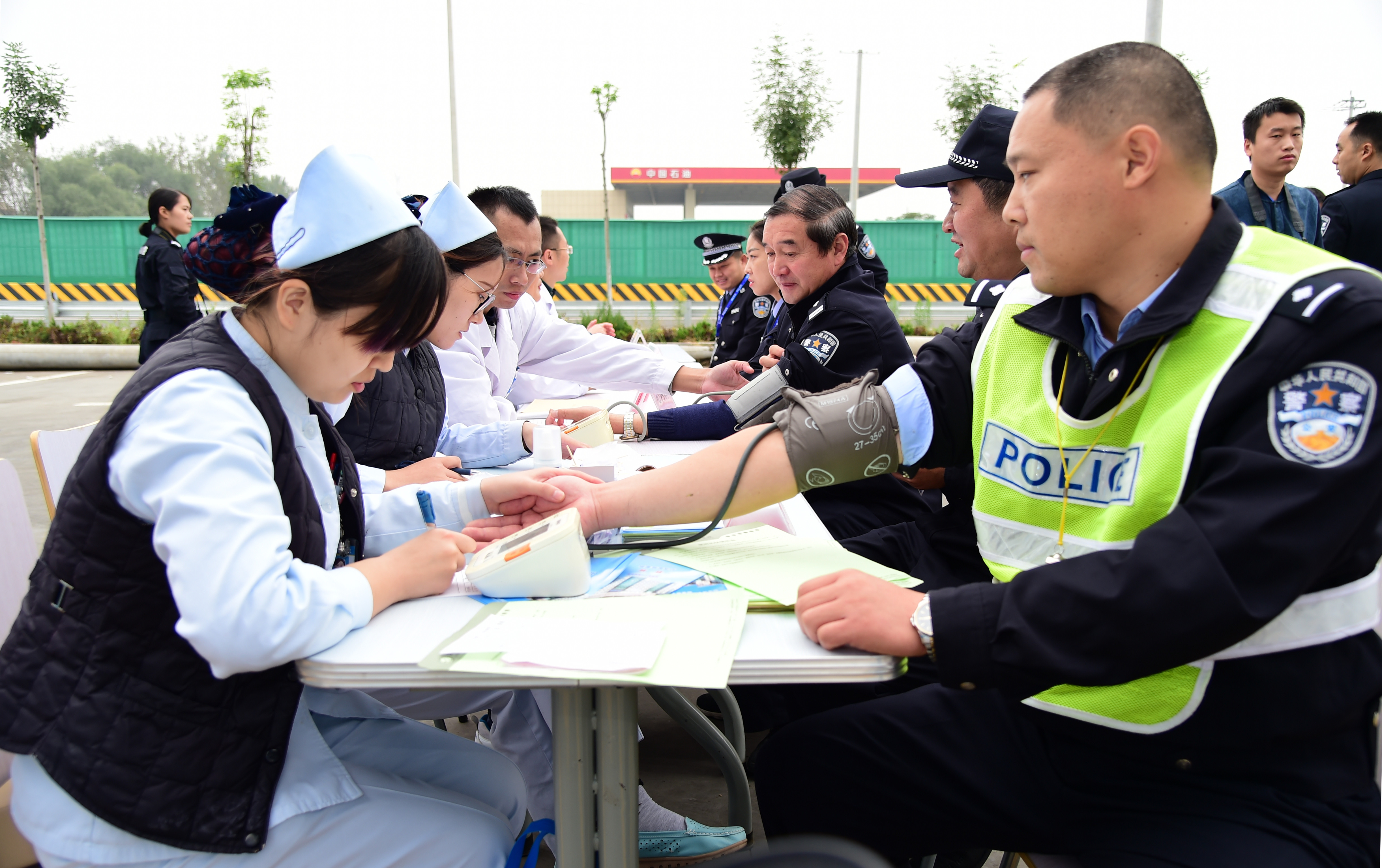在微山县公安局欢城分局院内,由医院心内、呼吸内、外科、心理咨询等专家组成的爱心义诊团对奋战一线的公安干警们进行健康查体,听诊、问诊、测血糖、血压、胸透、心电图等相关检查,让身处秋风秋雨中执勤的广大公安干警感受到了阵阵暖意。当日,共为50余名公安干警进行了免费查体。