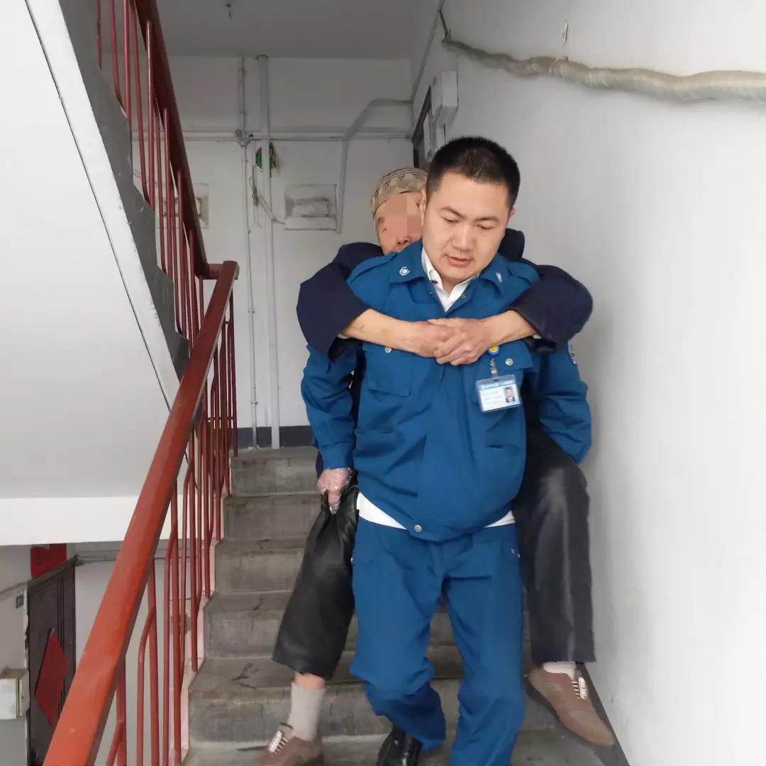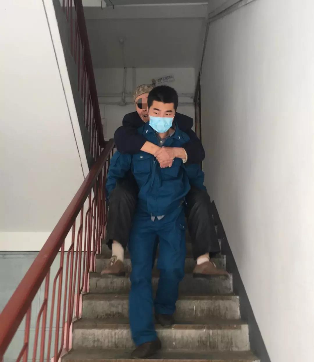 到达现场后,出诊医护人员发现房子建筑年代比较久远,楼梯窄且陡峭,而且老居民楼老年人居多,再加上患者没有家属,又找不到年青人帮忙抬担架,仅凭医护二人担架转运患者下楼非常困难,情急之下崔医生和郑护士一商量立即决定俩人轮流将老人背下楼。