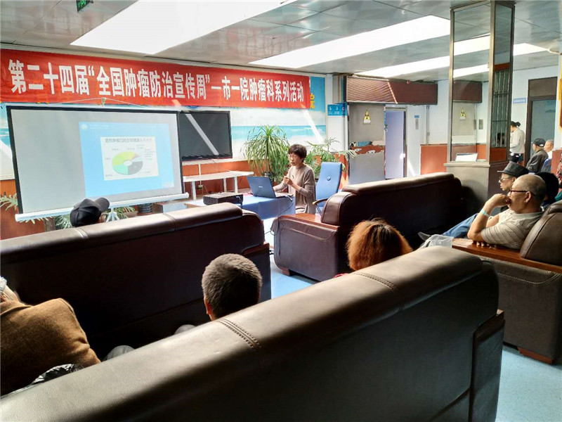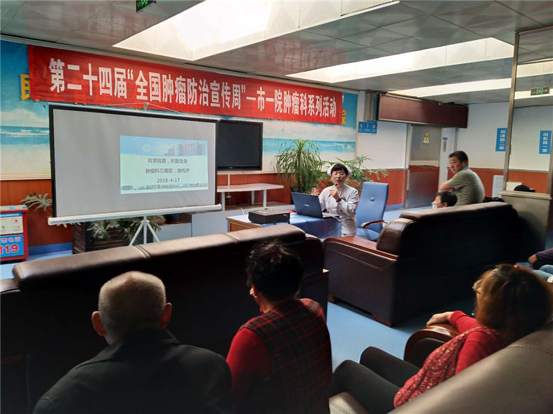 在放疗室候诊大厅,肿瘤科副主任医师种道群进行了关于肿瘤防治专题知识讨论,肿瘤三病区护士长唐向芹讲授了主题为科学抗癌,关爱生命的讲座。
