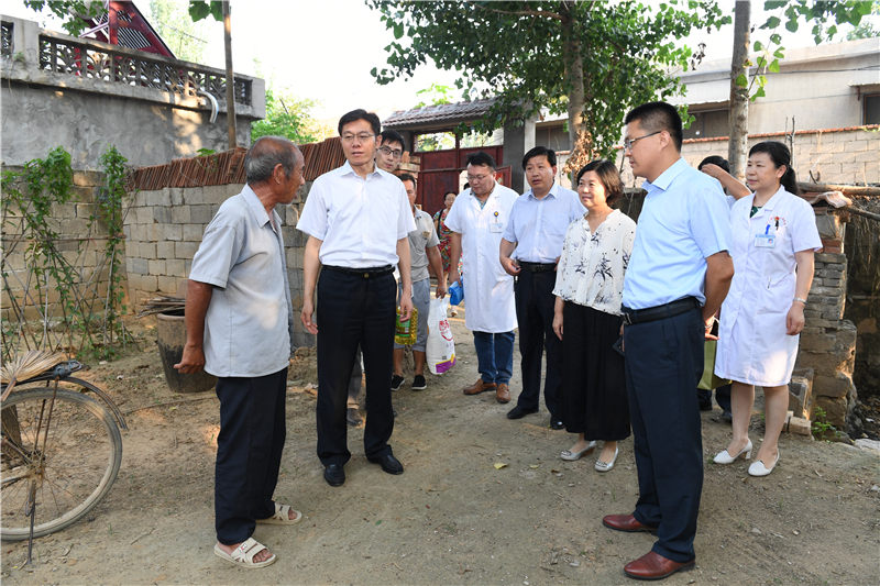 7月20日,市卫计委党委委员、医院党委书记、理事长孙树印,在医院党委委员、纪委书记郭金菊等医院相关科室负责人的陪同下,顶着炎炎烈日,冒着酷暑来到泗水县泗河街道中曲泗村进行走访慰问。