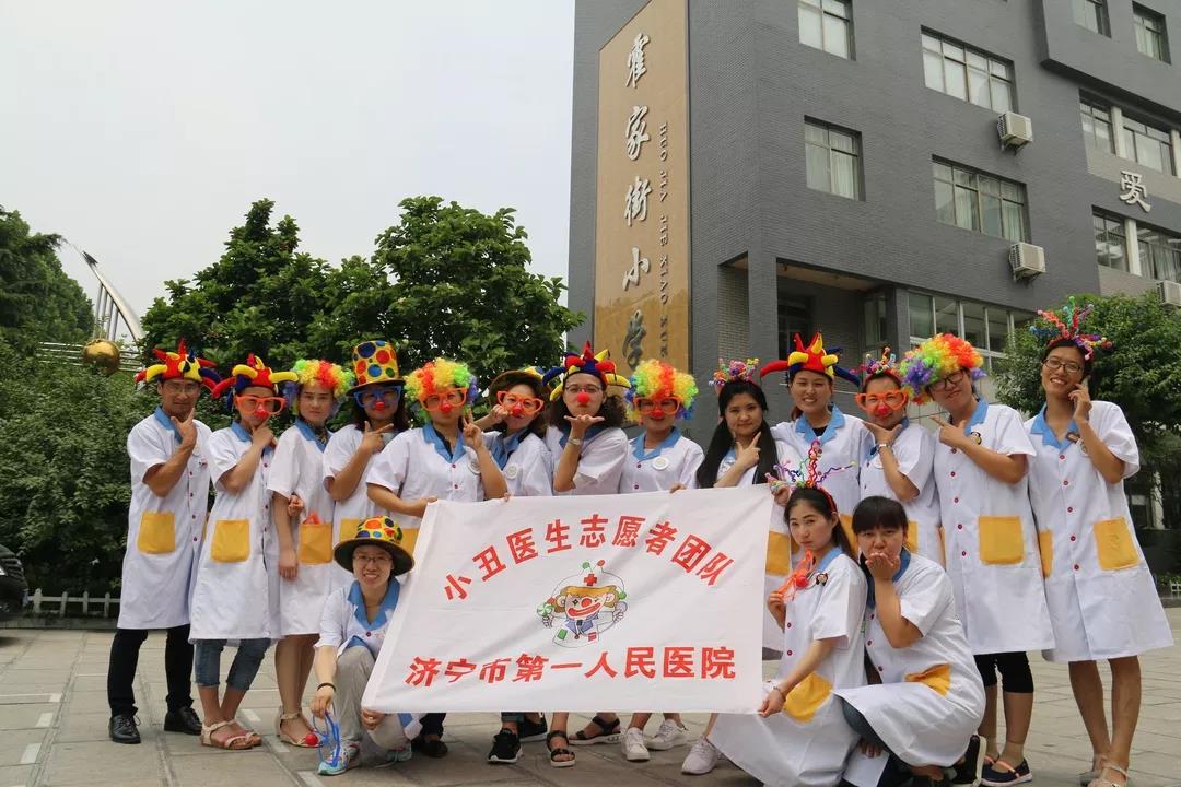 济宁市第一人民小丑医生志愿者团队成立于2015年,目前共有136名成员。这个公益组织的宗旨是以"用微笑抚慰心灵、用色彩传递快乐,用爱心感动世界"。 小丑医生们会利用各种小丑表演中常用的手段和其他一些技能如魔术、跳舞等种种方式安慰小患者、抚慰小患者,旨在通过欢笑缓解患儿对医院的不适和恐惧,减轻疾病痛苦,同时为患者及家属提供精神支持,从总体上改善患儿治疗效果。有了小丑医生的陪伴,疾病显得不再那么难以战胜,检查和操作也显得不那么令孩子们恐惧和陌生。 小丑医生们送科普进校园是为了从孩子抓起,提升他们的健康素养。他们的干预内容主要包括常见疾病的防治知识和自救互救技能培训。小丑医生们用情景剧式的授课方式、通俗易懂的语言,结合特意制造的欢快的现场氛围,让孩子们在快乐中学到医疗科普知识。